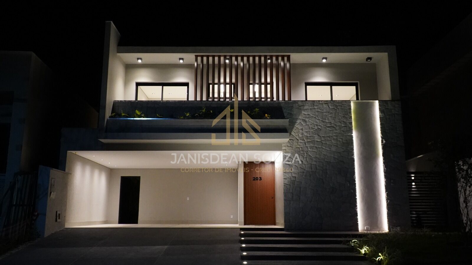 O imóvel ainda dispõe de lavabo com pia esculpida em mármore Bege Bahia, área de serviço funcional, projeto luminotécnico completo e acesso lateral independente para a área da piscina. São 4 vagas de garagem, sendo 2 cobertas e 2 descobertas.